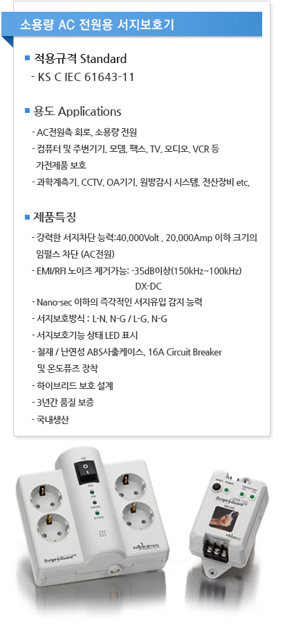 ■ 공칭전압 Un : AC 220V ■ 최대연속사용전압 Uc : AC 320V ■ 전압보호레벨 Up : 2.0kV ■ 서지용량 : Phase 40kA, Imax 20kA/mode ■ 동작표시기능 : Power & Protection LED ■ 제품크기 : 74(W)×150(H)×51(D) mm